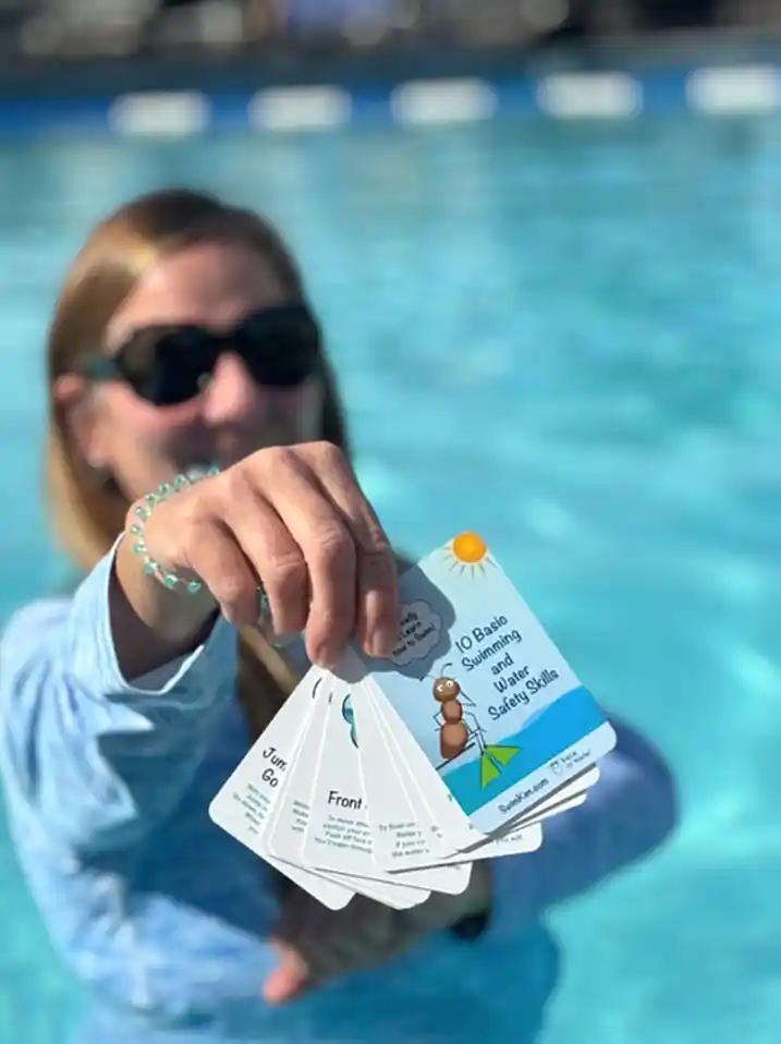 Great for play groups and family get togethers! Bring these waterproof cards to the pool to practice! These 10 waterproof skill cards have a wrist coil to quickly reference the 45 mini lessons from the Teach Your Child How to Swim eBook.